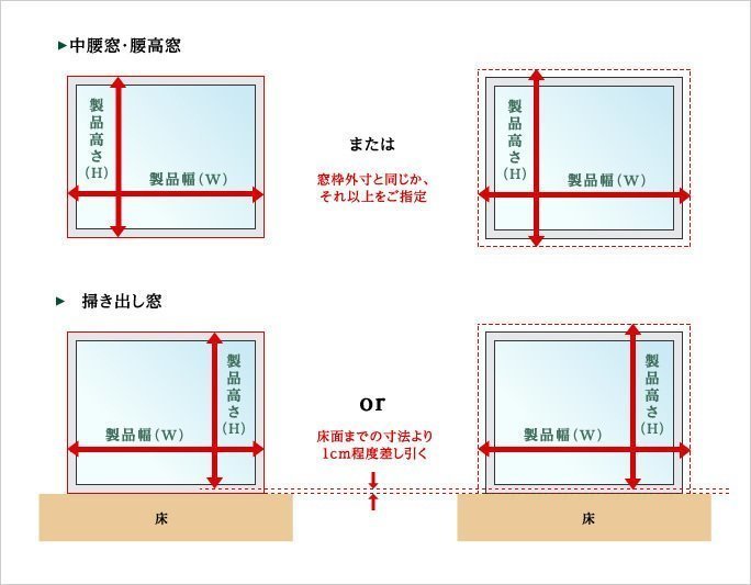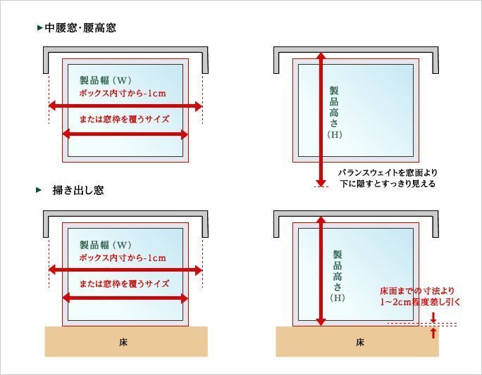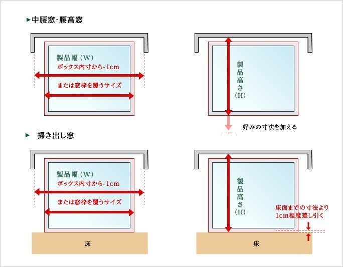 ・窓下に飾り棚やテーブル・ベットなどおく場合は高さを考慮して丈の長さを決定してください。