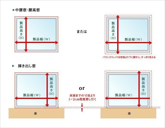 窓下に壁がある窓・ランナーのカン下(穴内下側)から窓枠までの長さを測り、そこから15~20cm長くします。